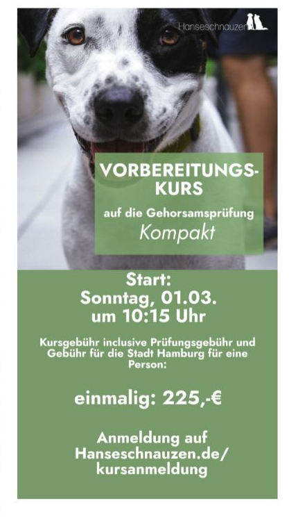 Der Kurs läuft über drei Termine und ein Termin für die Prüfung und ist für dich und deinen Hund geeignet, wenn ihr schon ein richtig gutes Team seid.